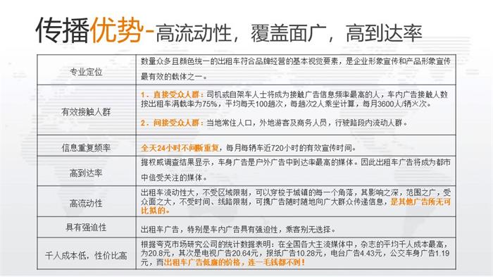 3、出租车广告是可见机会大的户外广告媒体,受众在每日的生活工作中势必会接触到我们传递的广告信息。