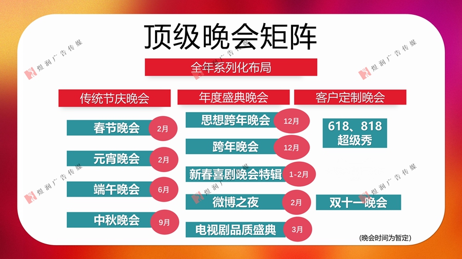 喜剧/脱口秀、真人秀节目、音乐节目、文化节目、生活方式、顶级晚会、电视剧。