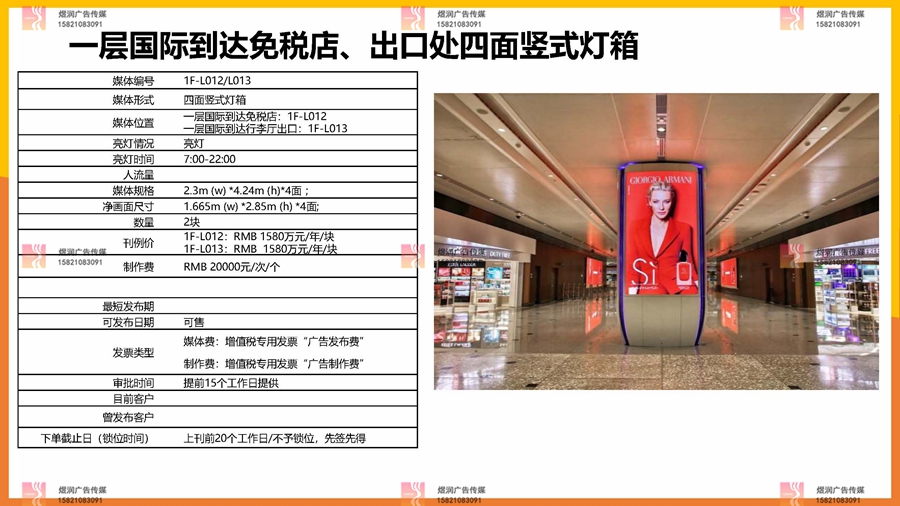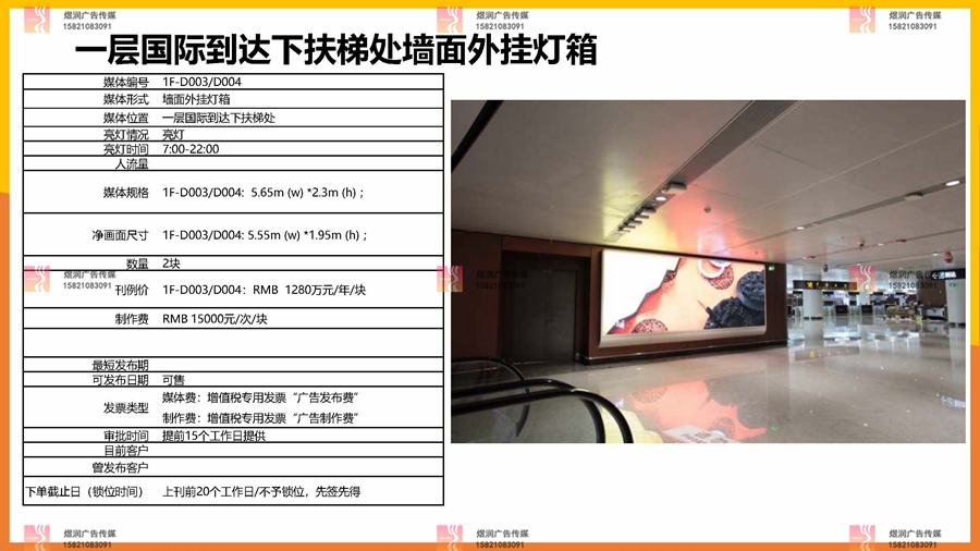 灯箱面积,套装100%副高国际到达旅客、环境封闭,媒体干扰小、与旅客近距离平行设置,全方位可视角度,视觉冲击力强,受众回忆率高。
