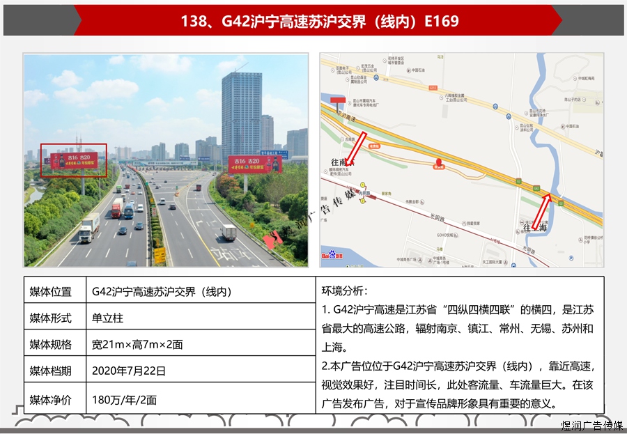 2.本广告位位于G42沪宁高速苏沪交界(线内),靠近高速,视觉效果好,注目时间长,此处客流量、车流量巨大。在该广告发布广告,对于宣传品牌形象具有重要的意义。