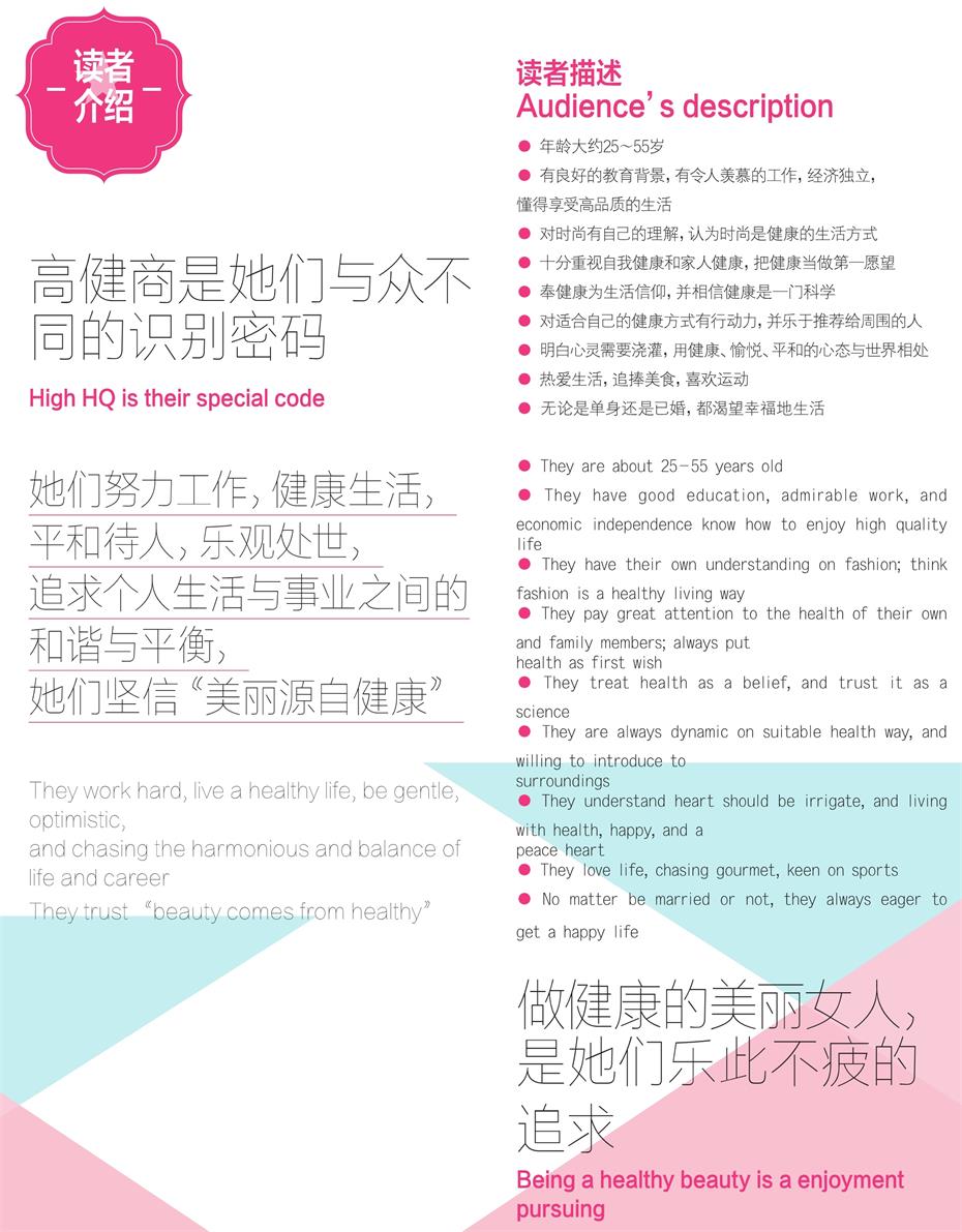 立足于健康与美容产业,科学时尚严谨的科普类杂志,与日本知名出版集团BP社旗下发行量排名第一的刊物《health》版权合作,与中国权威检疫检验机构、科研实验室、权威媒体CCTV强强联合,日本和国内顶级专家团队学者坐阵.