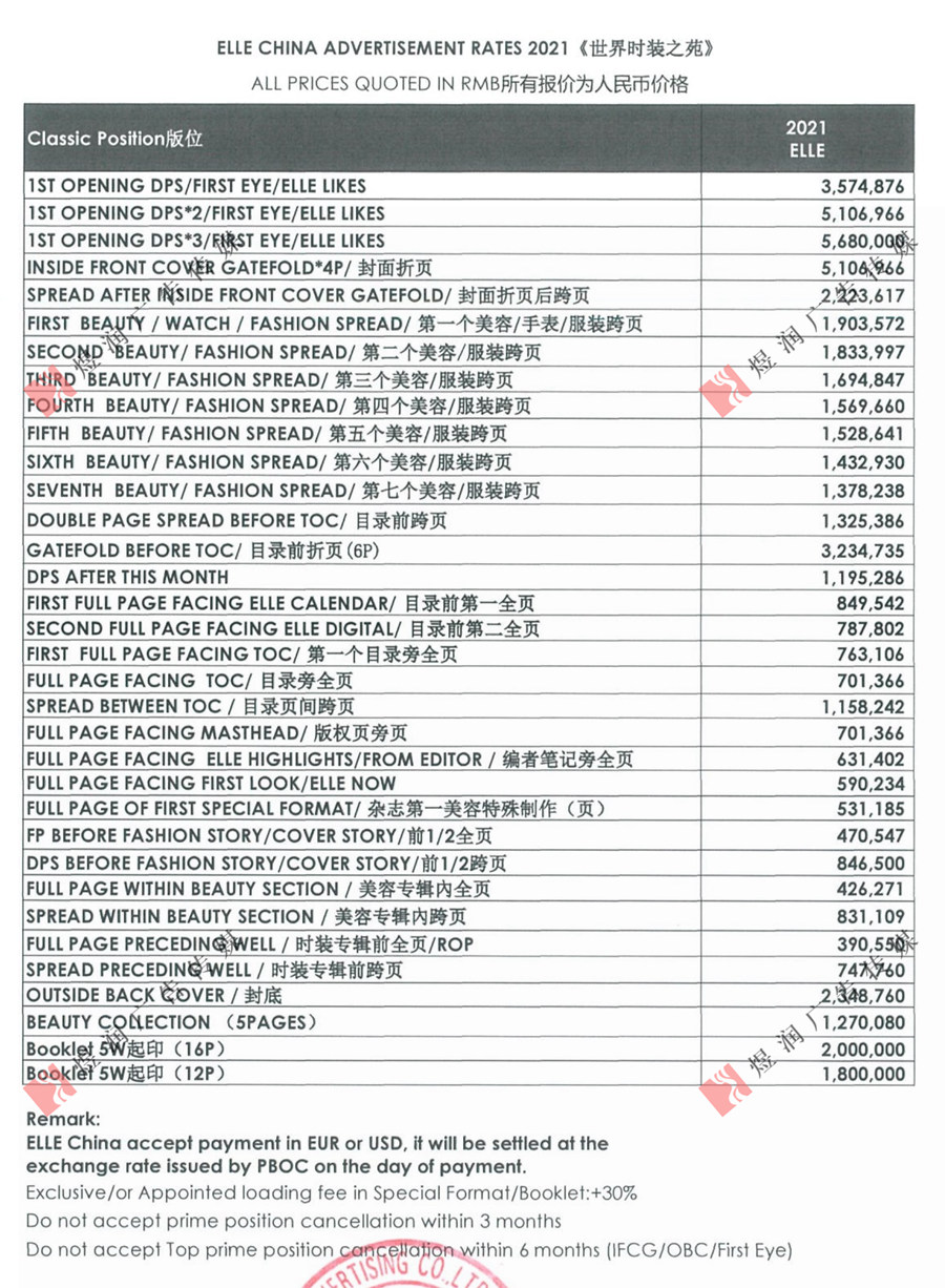 ELLE世界时装之苑杂志广告价格: