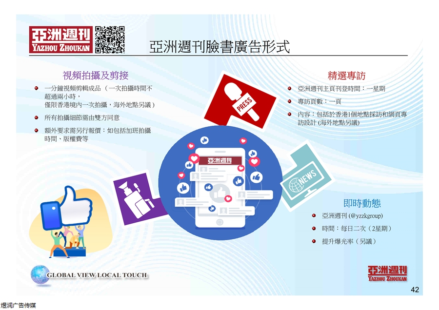 《亚洲周刊》创刊于1987年12月,在香港编辑发行,是全球第一本、且是目前唯一一本国际性中文时事周刊。亚洲周刊广告投放就找煜润广告传媒,一手的媒介资源 一揽子传播计划 一站式全程服务!为客户提供全面的传媒策略、媒介购买、媒体执行、品牌创意、营销策划等服务。煜润广告传媒竭诚为国内外企业及区域各企业提供及时、有效、全面的服务!